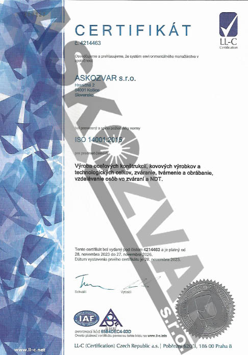 Po ročnej príprave spoločnosti sa môžeme pochváliť, že sme majiteľmi certifikátov 45001 (Systém manažérstva bezpečnosti a ochrany zdravia pri práci)) a ISO14001 (Systém environmentálneho manažérstva). To svedčí o kvalite spoločnosti