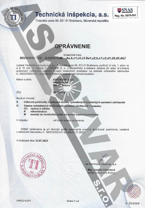 Po úspešnom audite Technickou Inšpekciou, naša spoločnosť získala oprávnenie na výrobu, navrhovanie, opravy a konštrukciu vyhradených zdvíhacích zariadení. Takže od tlakových nádob cez oceľové konštrukcie po žeriavy zvládneme všetko.