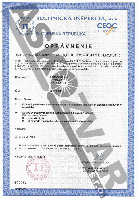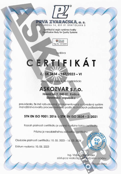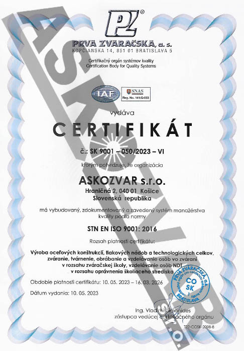 Spoločnosť ASKOZVAR s.r.o. bola založená spoločenskou zmluvou zo dňa 4.6.1997 podľa zak. č. 513/91 Zb. Predstavuje modernú, dynamicky sa rozvíjajúcu spoločnosť, cieľom ktorej je priniesť kvalitné vzdelanie všetkým, ktorí o to prejavia záujem. Naša spoločnosť je postavená na odbornosti a profesionalite.. Máme zavedený systém kvality ISO 9001:2000 , systém kvality zvárania EN ISO 3834-2, ISO 45001 (Systém manažérstva bezpečnosti a ochrany zdravia pri práci) a ISO14001 (Systém environmentálneho manažérstva), čo garantuje zabezpečenie maximálnej profesionality a kvality ponúkaných služieb a to: